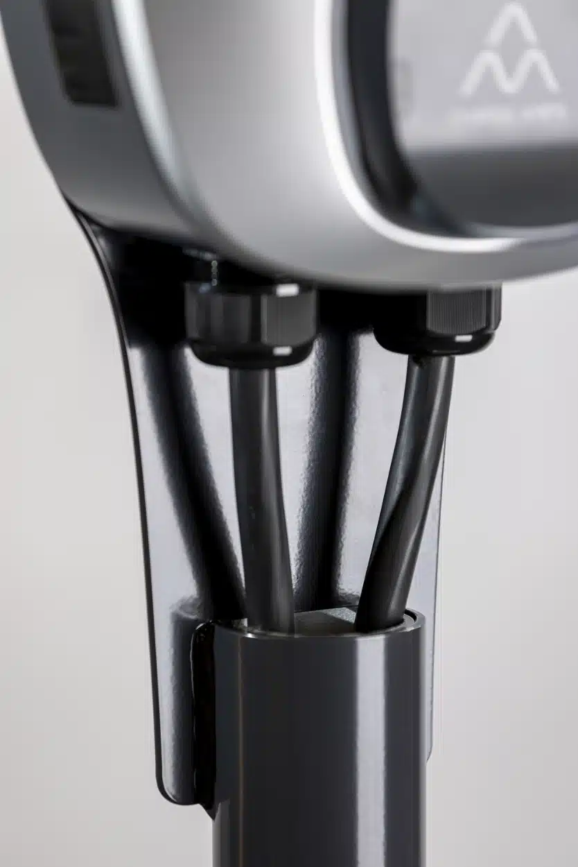 Next Green Charge Amps Dawn -asennuslevy on luotettava ja viimeistelty ratkaisu, kun Charge Amps Dawn -latausasema halutaan asentaa tukevasti pylvääseen ulkotiloissa.